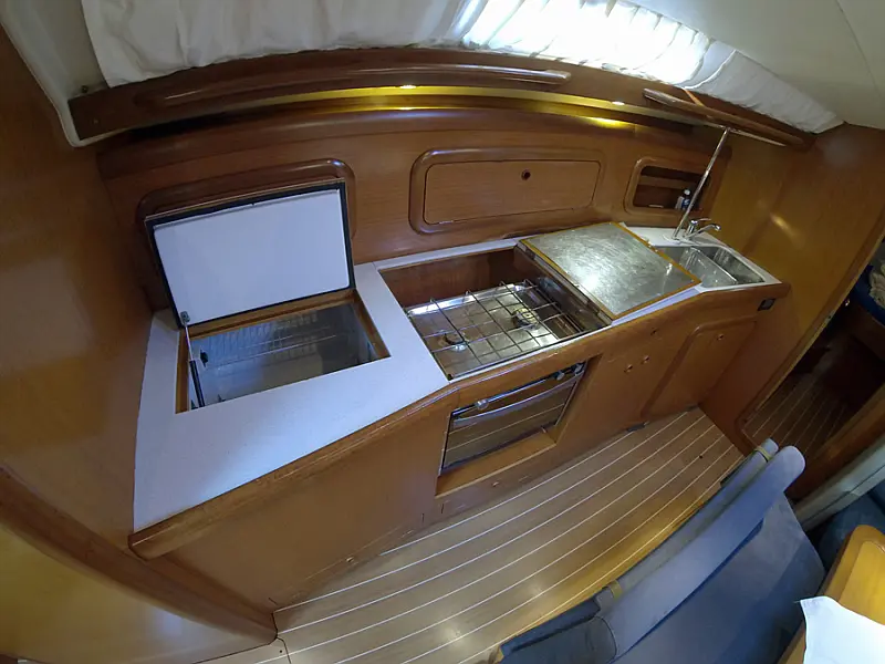 Elektrische Ankerwinde , Bimini top , Pflichtpersenning Tisch , Cocpit Kissen , Heckdusche , Badeleiter , Sprayhood , Außenbordmotor , Beiboot mit Außenborder , Blauer Rumpf
